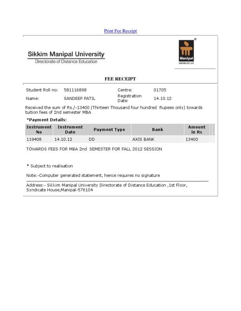 " I understand that FEES once paid will NOT be refunded. Electives: Final semester MIT, MBA, MCA, MCOMIS, MAJM, MBA-Banking, MScIT and BScTT Directorate of Distance Education Sikkim Manipal University 6st Floor, MAHE old building MANIPAL 576 104 ... Return Doc